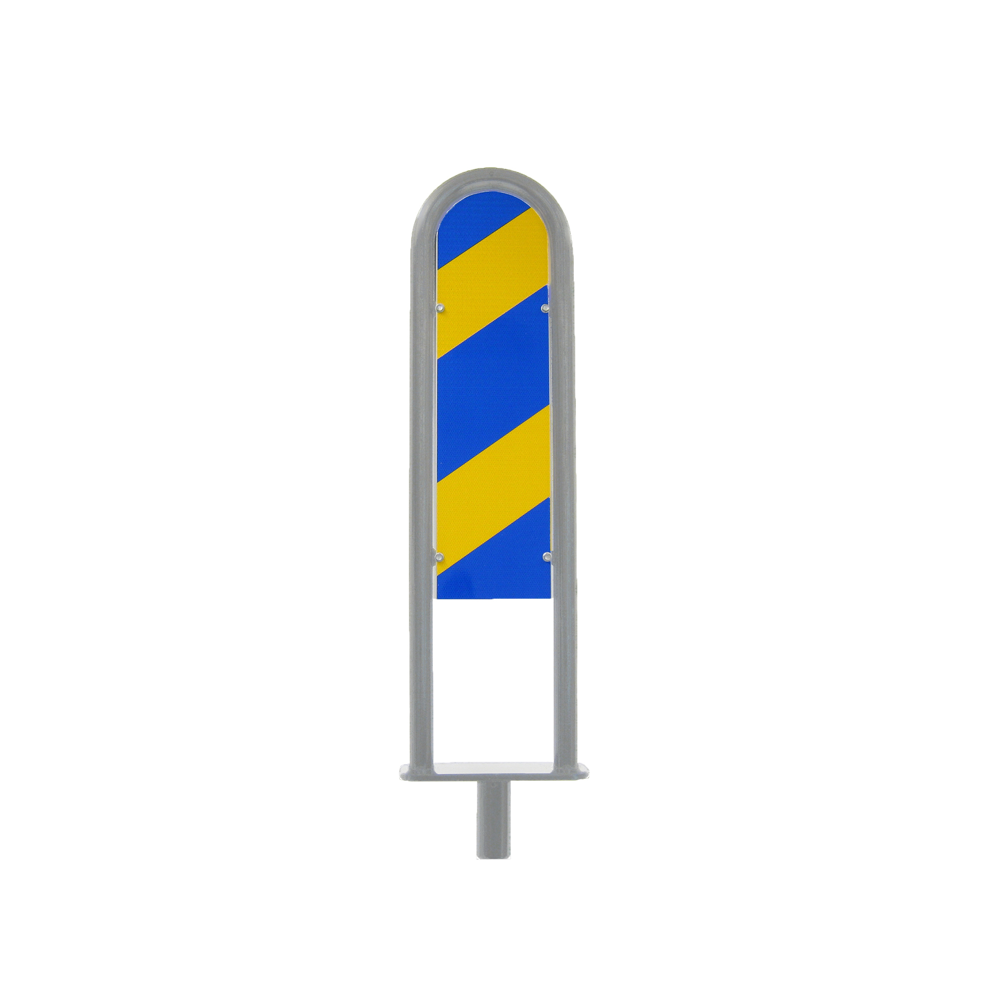 Dubbelsidig markeringsskärm i varmförzinkad stålbåge. Kan även fås i valfri kulör. Sätts enkelt i ett standardfundament för 60 mm rör. Kan även tillverkas med olika budskap. Höjd: 1100 mm (ovanför fundament) Bredd: 300 mm Rördiameter: 42 mm