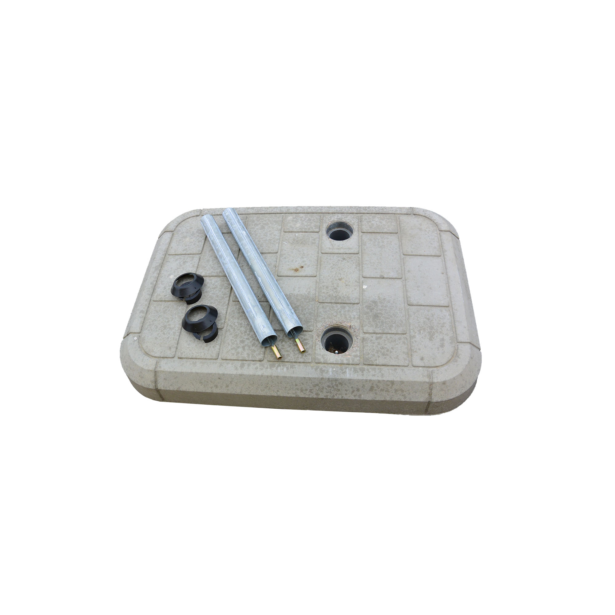 Flyttbar refug för montering av skyltbågar och pollare. Levereras med 2 st justerbara rör med helgängad stång (201012) samt låskil och täthuv. Längd 1300 mm Bredd 900 mm Höjd 160 mm Vikt ca 500 kg