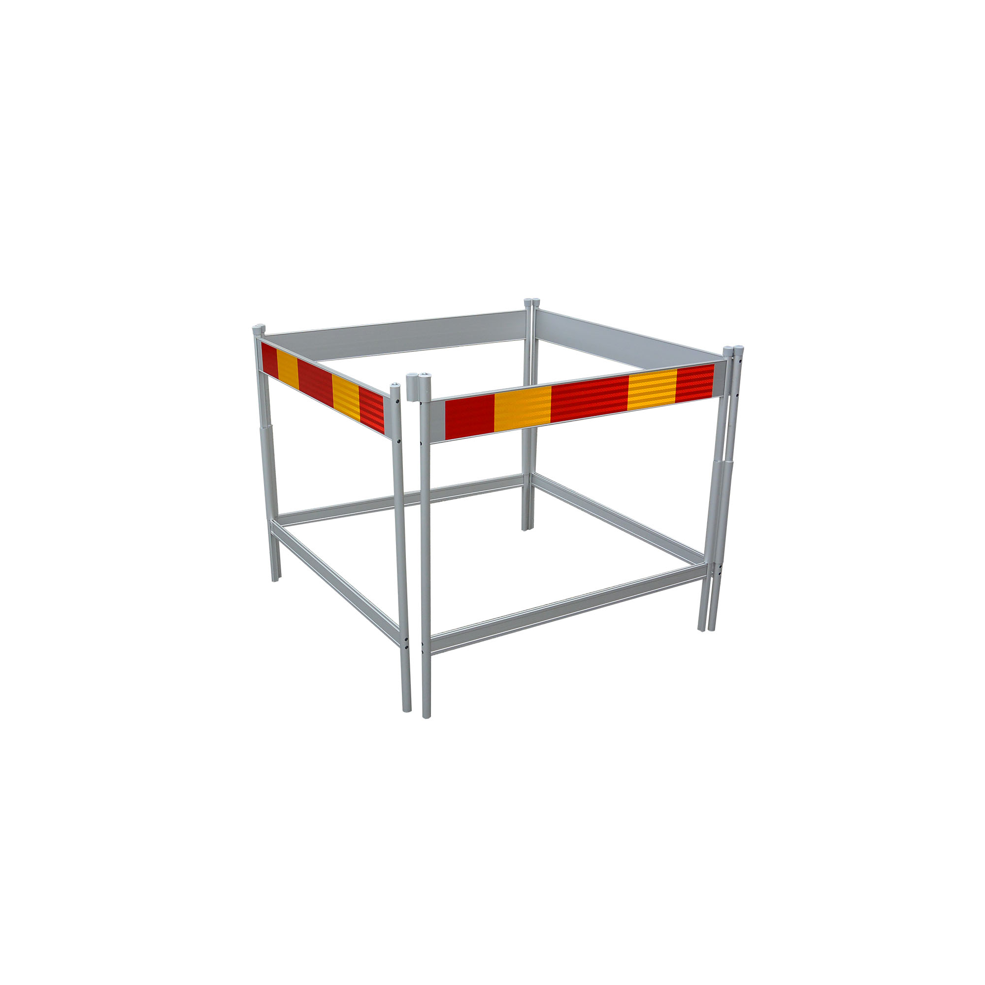 Tillverkad av aluminiumprofil och försedd med reflex. Flera grindar kan enkelt fästas ihop till en större avstängning. Lätt, smidig och tar liten plats ihopfälld, 1120x950x100 mm Höjd 900 mm Sida 1000 mm Total längd 4000 mm Vikt 13 kg